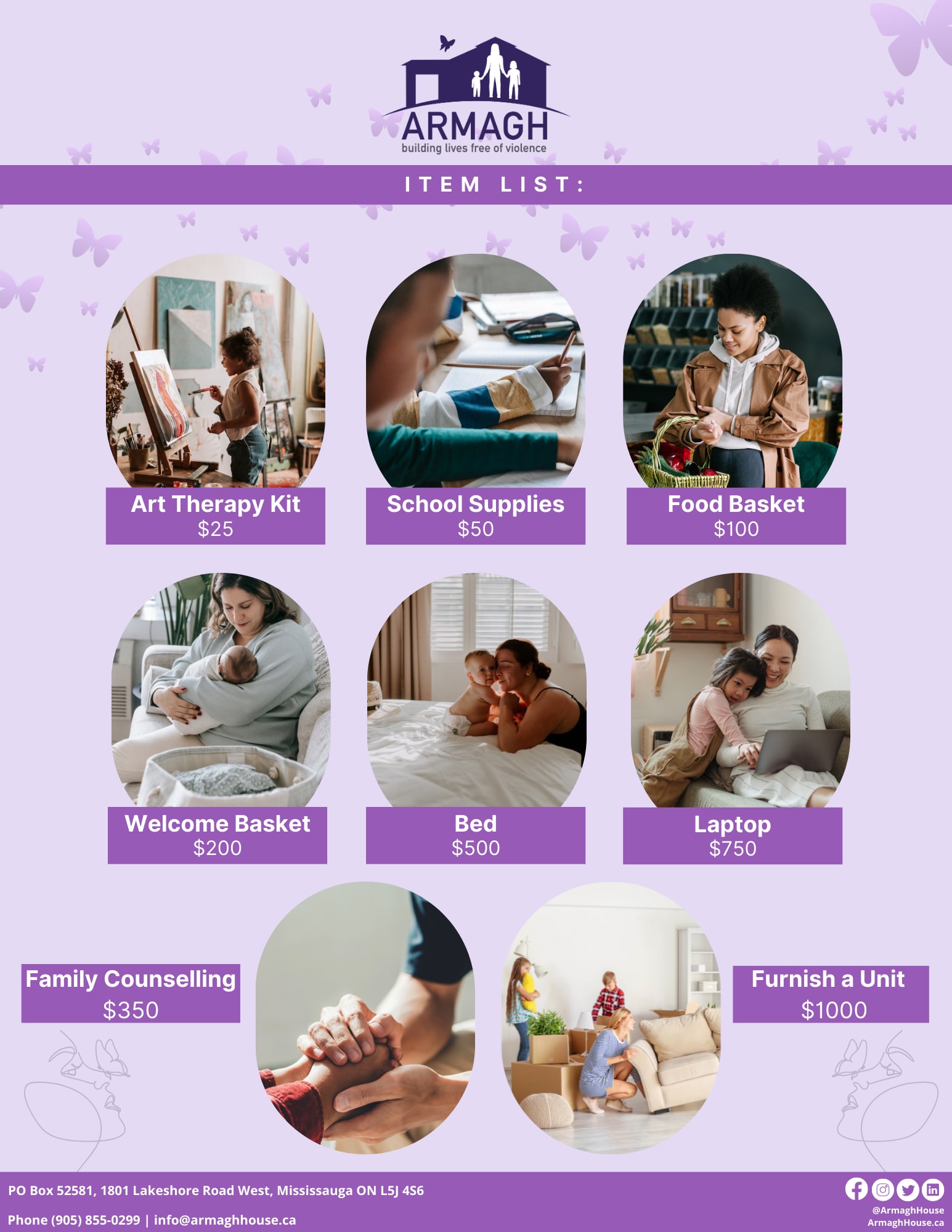 As part of the evening’s program, we will host a live auction featuring exciting items and experiences generously donated by local partners and community champions. As well as a Wings of Change portion of the program where you can support various programs and/or needs. All proceeds from the auction will be directed to Armagh House, enabling them to continue their vital work in providing stability, support, and hope to women and families in need.