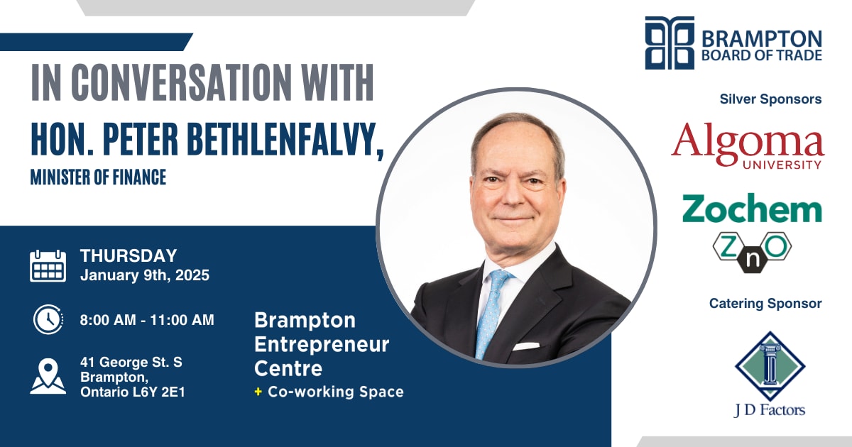 Join us on the morning of Thursday, January 9th, 2025, at the Brampton Entrepreneur Centre for an engaging and insightful event with Ontario's Minister of Finance, the Honourable Peter Bethlenfalvy.