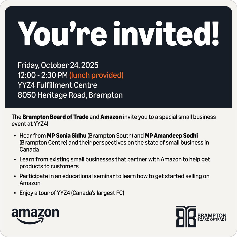 We would like to invite you to a special event at Amazon’s YYZ4 Fulfillment Centre on October 24th, 2025, from 12:00 PM to 2:30 PM. This event, hosted by the Brampton Board of Trade, and in partnership Amazon, will showcase how local businesses can leverage Amazon's platform for growth. We will also be joined by two special guests, MP Sonia Sidhu (Brampton South) and MP Amandeep Sodhi (Brampton Centre) to hear their perspectives on the state of small business. Attendees will also receive a tour of YYZ4 (Amazon’s largest FC in Canada). Lunch will be provided.