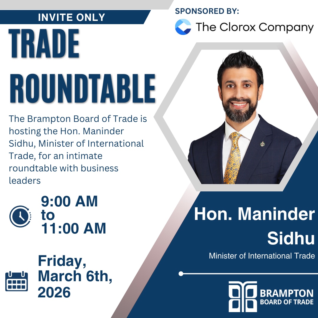 The Brampton Board of Trade is pleased to host the Hon. Maninder Sidhu, Minister of International Trade for an intimate roundtable with business leaders. Attendees will have the opportunity to share their perspectives on global opportunities and required supports as well as hear about federal government priorities in the Indian and Chinese markets as Canada builds new trade relationships.