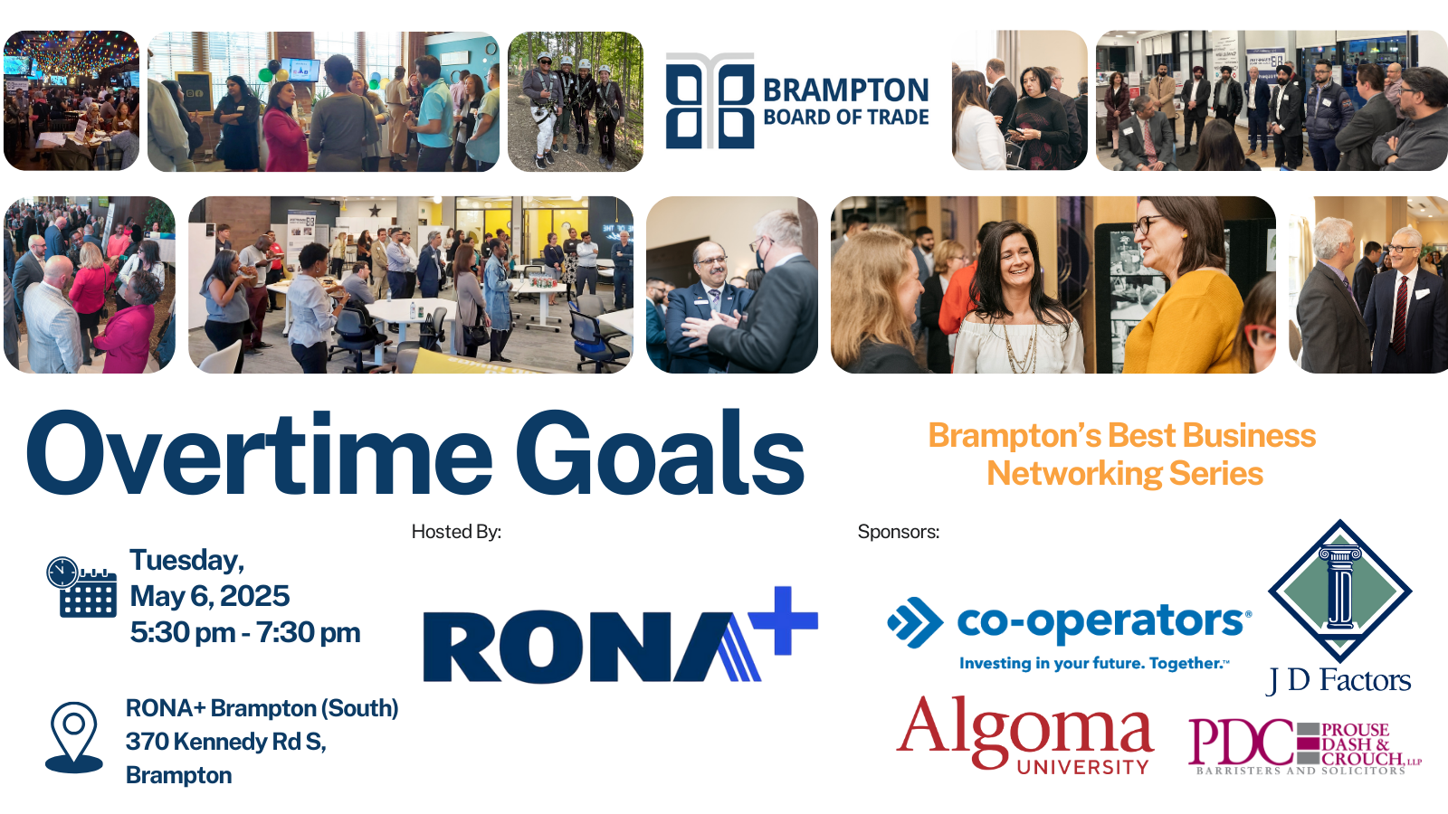 The Brampton Board of Trade's Overtime Goals Business Networking event, hosted by Rona+, offers an exciting and hands-on opportunity for business owners to connect and collaborate. Whether you’re looking to build relationships, discover new opportunities, or enhance your entrepreneurial skills, this event has something for everyone!