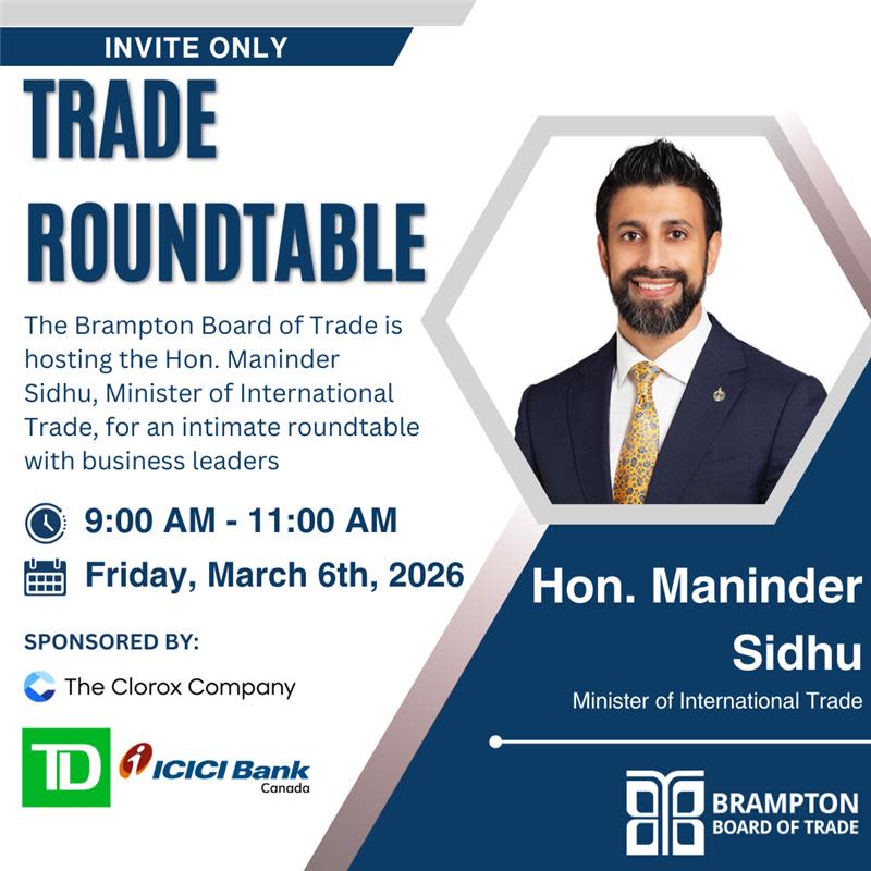 The Brampton Board of Trade is pleased to host the Hon. Maninder Sidhu, Minister of International Trade for an intimate roundtable with business leaders. Attendees will have the opportunity to share their perspectives on global opportunities and required supports as well as hear about federal government priorities in the Indian and Chinese markets as Canada builds new trade relationships.